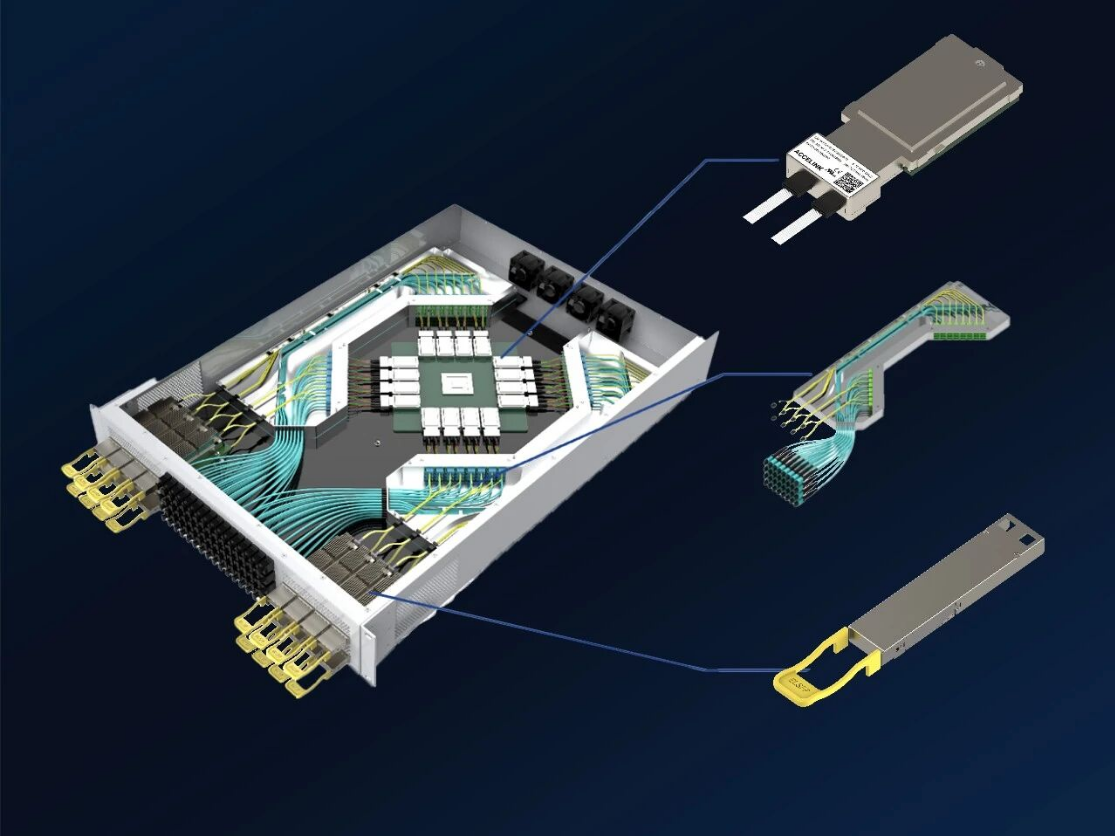 NPO通过将光引擎部署在交换芯片附近,大幅缩短电信号路径,在带宽密度、系统功耗和可维护性之间实现有效平衡。一套完整的NPO系统通常由光引擎OE、外置光源模块ELSFP, 及光纤管理模组FMU-Shuffle共同构成,涵盖先进封装、自动化光学耦合,综合布线及精密光学制造等多项底层能力。这意味着NPO的竞争,已从单一器件能力升级为系统工程能力与产业化能力的综合比拼。光迅科技已具备系统级全套方案提供能力。